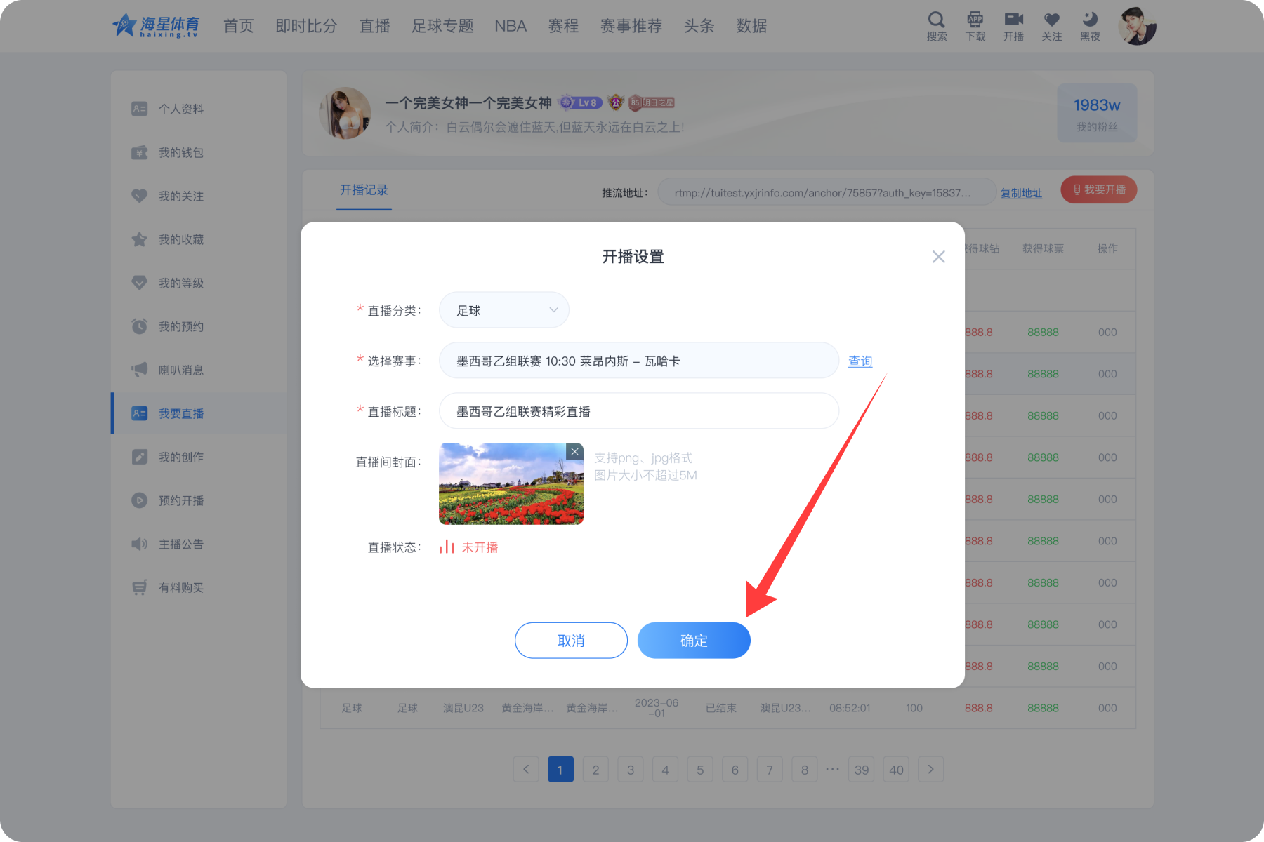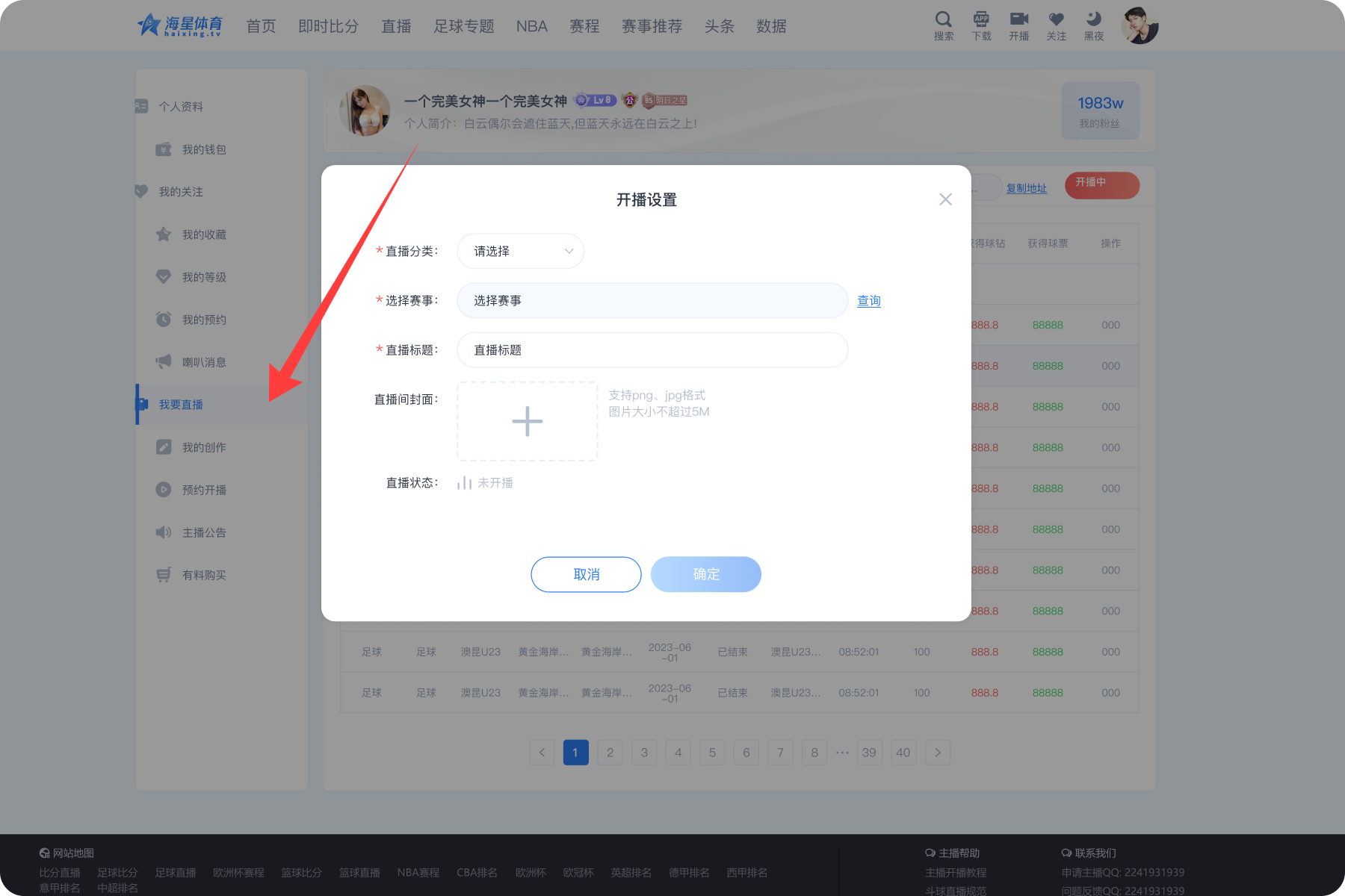 三、点击我要直播,然后选择直播的分类、赛事;依次填写直播标题与公告,点击确定。